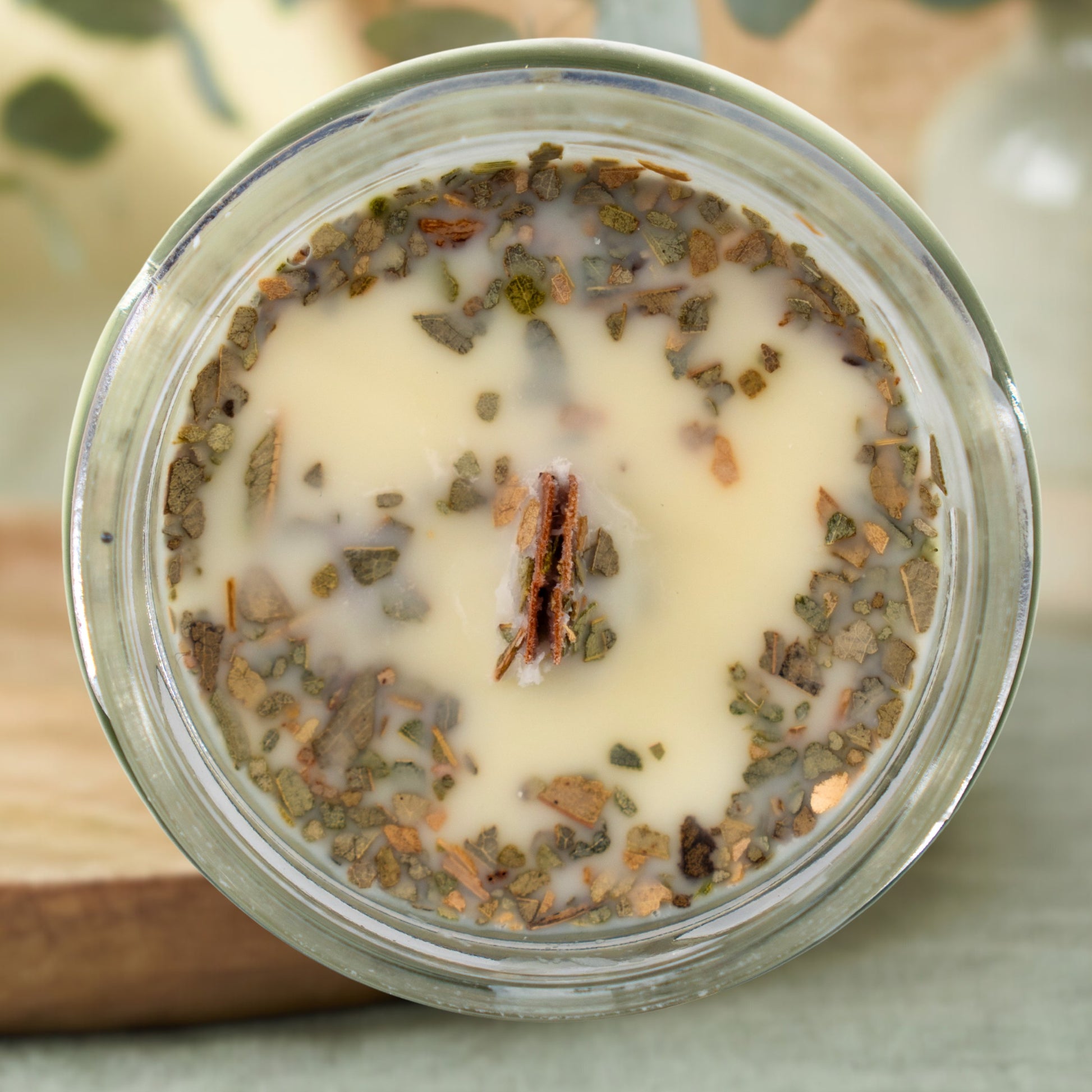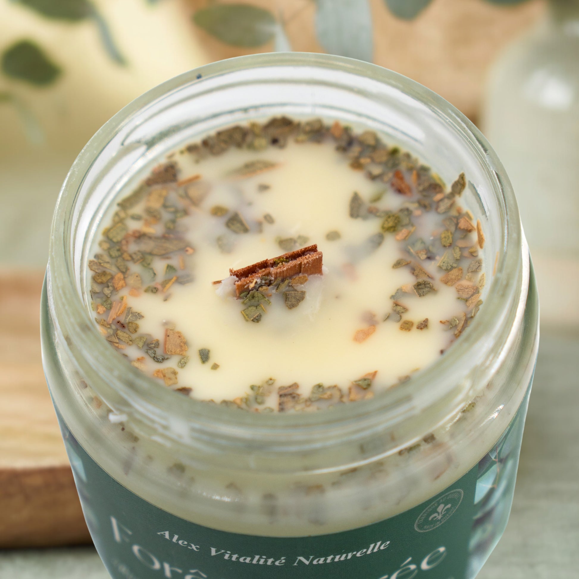 Sojawachs, Jojobaöl, ätherische Öle aus Zedernholz ( Cedrus atlantica ), Eukalyptus ( Eucalyptus radiata ), Weihrauch ( Boswellia carterii ), getrockneter Eukalyptus.