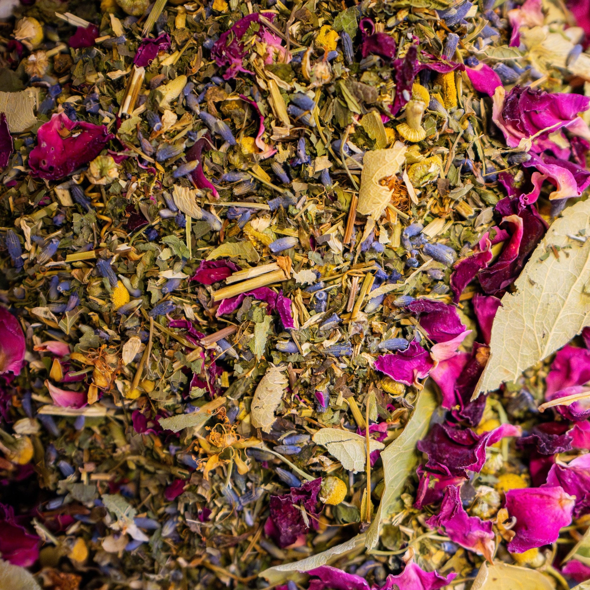 Passionsblume (Passiflora incarnata), Zitronenmelisse ( Melissa officinalis) , Linde (Tilia cordata) , Deutsche Kamille (Matricaria chamomilla) , Lavendel (Lavandula angustifolia) , Rosenblütenblatt (Rosa sp.)