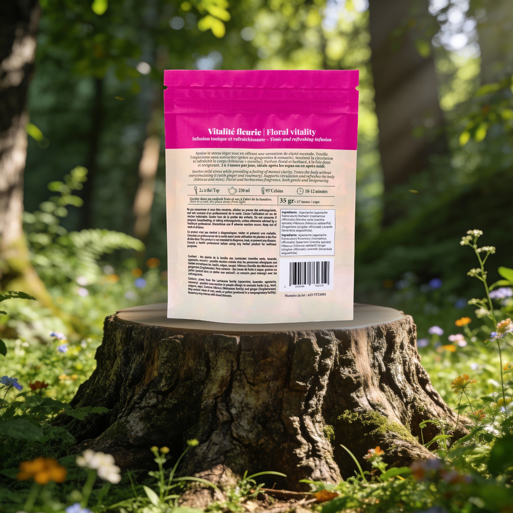 Enthält: Pflanzen aus der Familie der Lippenblütler (Lamiaceae) (Grüne Minze, Lavendel, Duftnessel, Rosmarin) – mögliche Kreuzreaktion bei Personen mit Allergien gegen aromatische Kräuter (z. B. Basilikum, Oregano, Salbei). Hibiskus (Malvaceae) und Ingwer (Zingiberaceae).